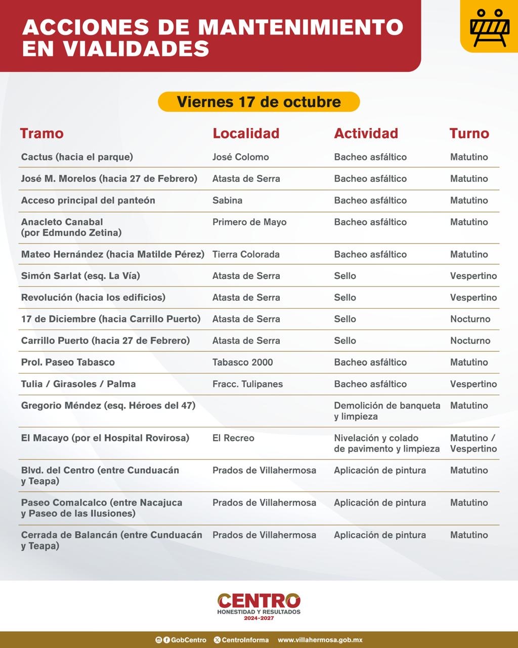 Refuerzan bacheo y alumbrado este viernes en Centro para mejorar vialidades