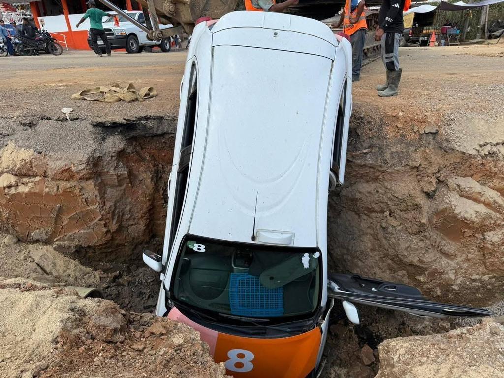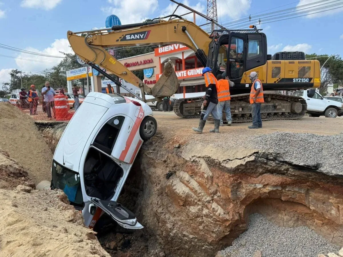 El incidente ocurrió en un tramo donde la Comisión del Agua del Estado de Veracruz mantiene trabajos en proceso. De acuerdo con reportes preliminares, el conductor del taxi con número económico 8 avanzó por el área intervenida sin atender las advertencias, lo que provocó que la unidad terminara dentro de la zanja abierta para las labores de reparación.