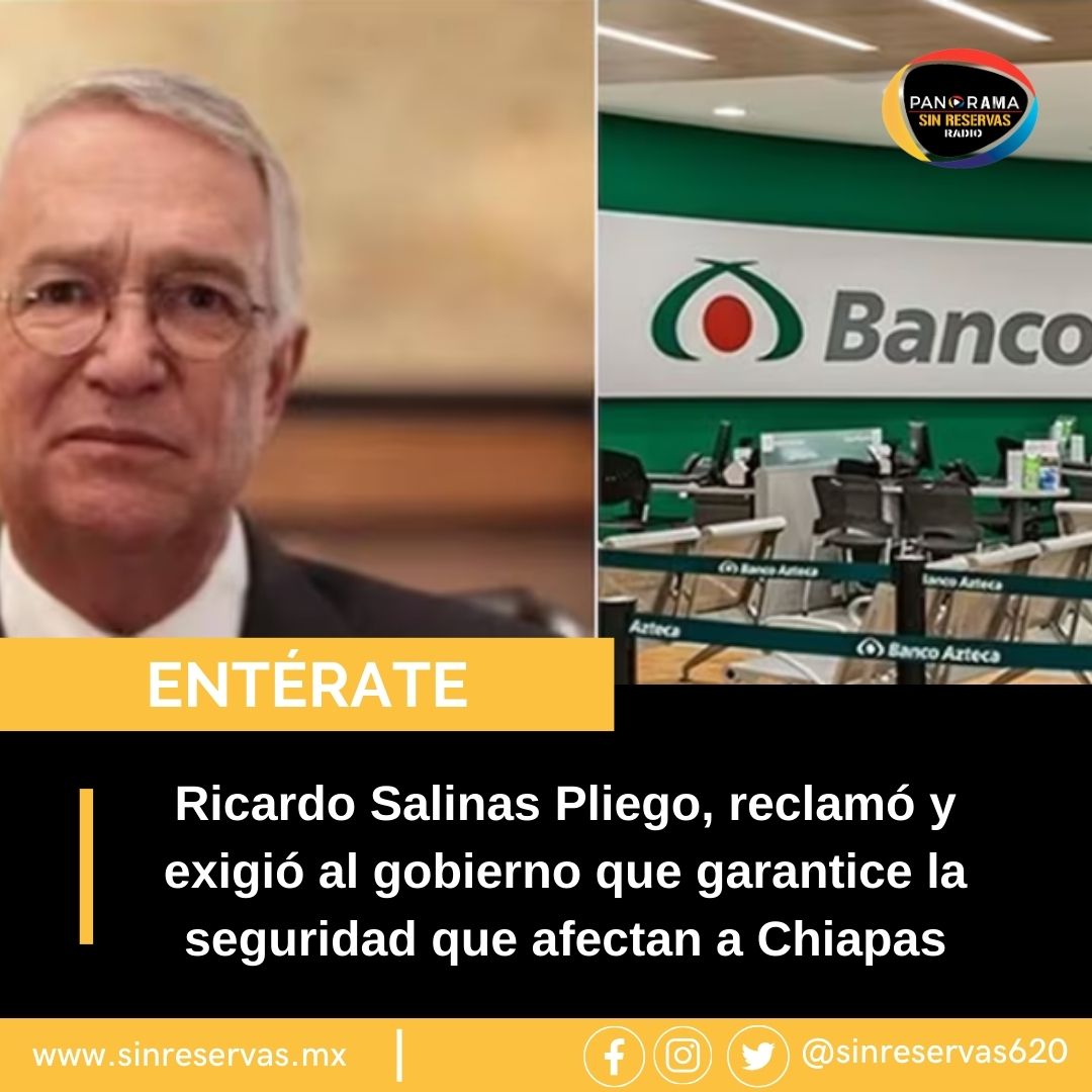 El presidente de TV Azteca, Ricardo Salinas Pliego, reclamó y exigió al gobierno que garantice la seguridad ante los crecientes actos cr1min4les que afectan a Chiapas, donde la viol3nc1a cobró la v1da de Abraham González, gerente en turno de una sucursal de Banco Azteca asaltada en Copainalá.