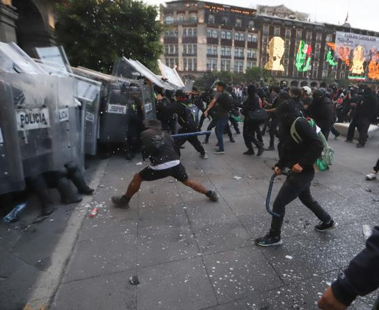 Alrededor de 150 encapuchados realizaron destrozos en mobiliario urbano, estaciones del Metro y algunos edificios públicos, además de romper vidrios y lanzar explosivos en el Zócalo. La Secretaría de Seguridad Ciudadana (SSC) intervino según los protocolos para proteger a los presentes y el personal gubernamental, resultando en tres policías con lesiones menores.