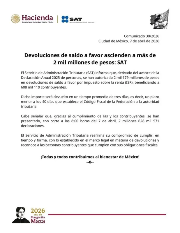 El Servicio de Administración Tributaria (SAT) informó que, como resultado del avance en la Declaración Anual 2025 de personas físicas, se han autorizado devoluciones de saldo a favor por un monto de 2 mil 179 millones de pesos, beneficiando a 608 mil 119 contribuyentes.