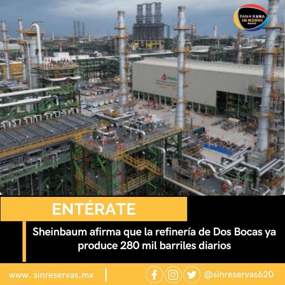 La presidenta Claudia Sheinbaum Pardo aseguró que la refinería Olmeca en Dos Bocas, Tabasco, ya opera con una producción estimada de 280 mil barriles diarios, señalando que el complejo energético “está funcionando súper bien”.
