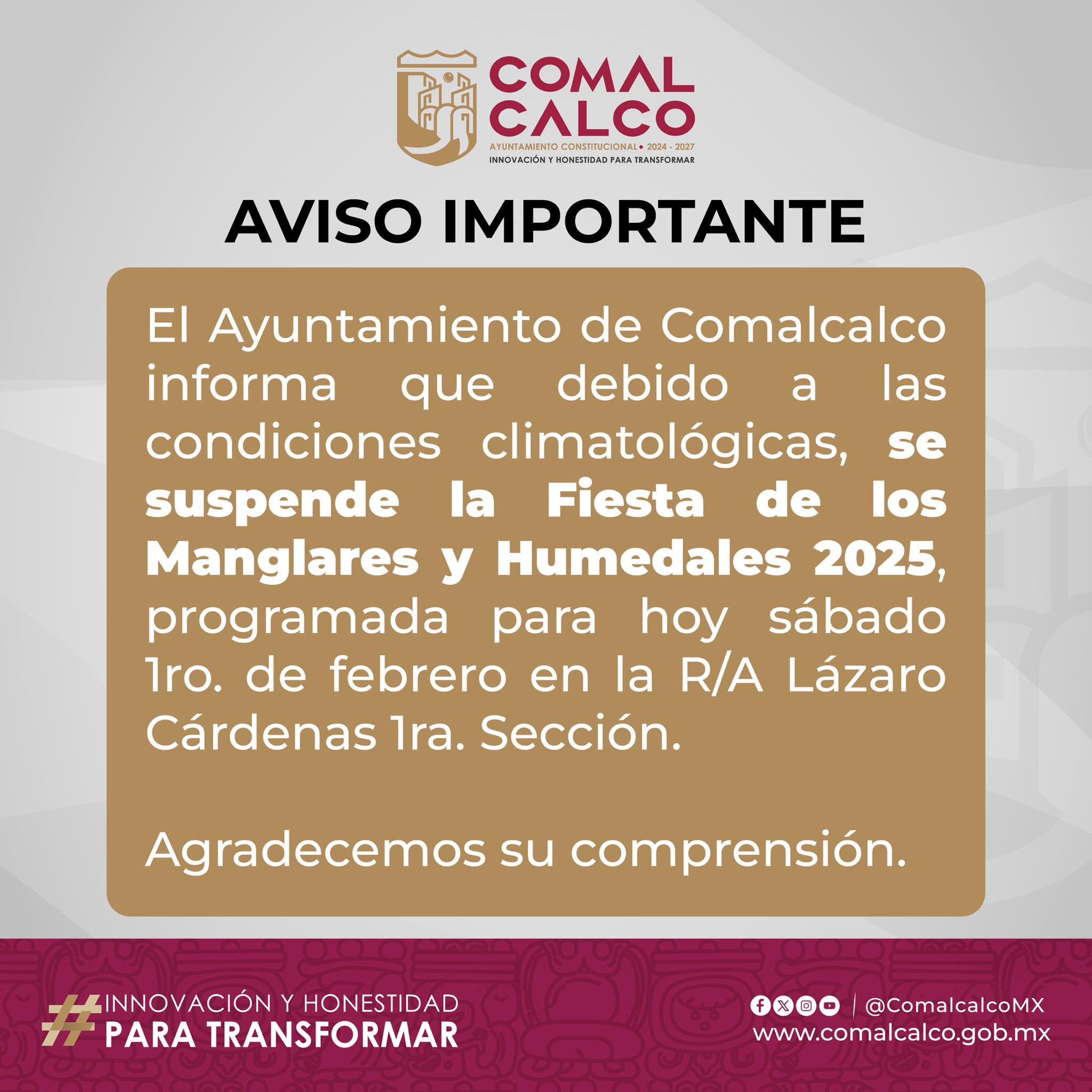 El Ayuntamiento de #Comalcalco informó que, debido al mal tiempo, se suspende la Fiesta de los Manglares y Humedales 2025, que estaba programada para este sábado en Lázaro Cárdenas 1era Sección. Se esperan próximas indicaciones sobre su reprogramación.