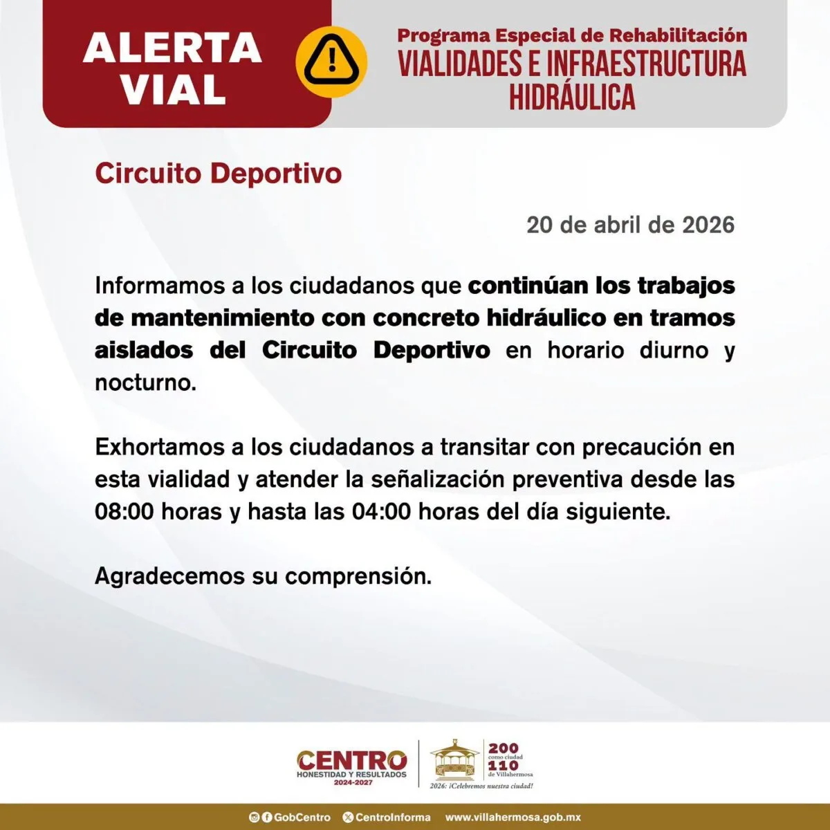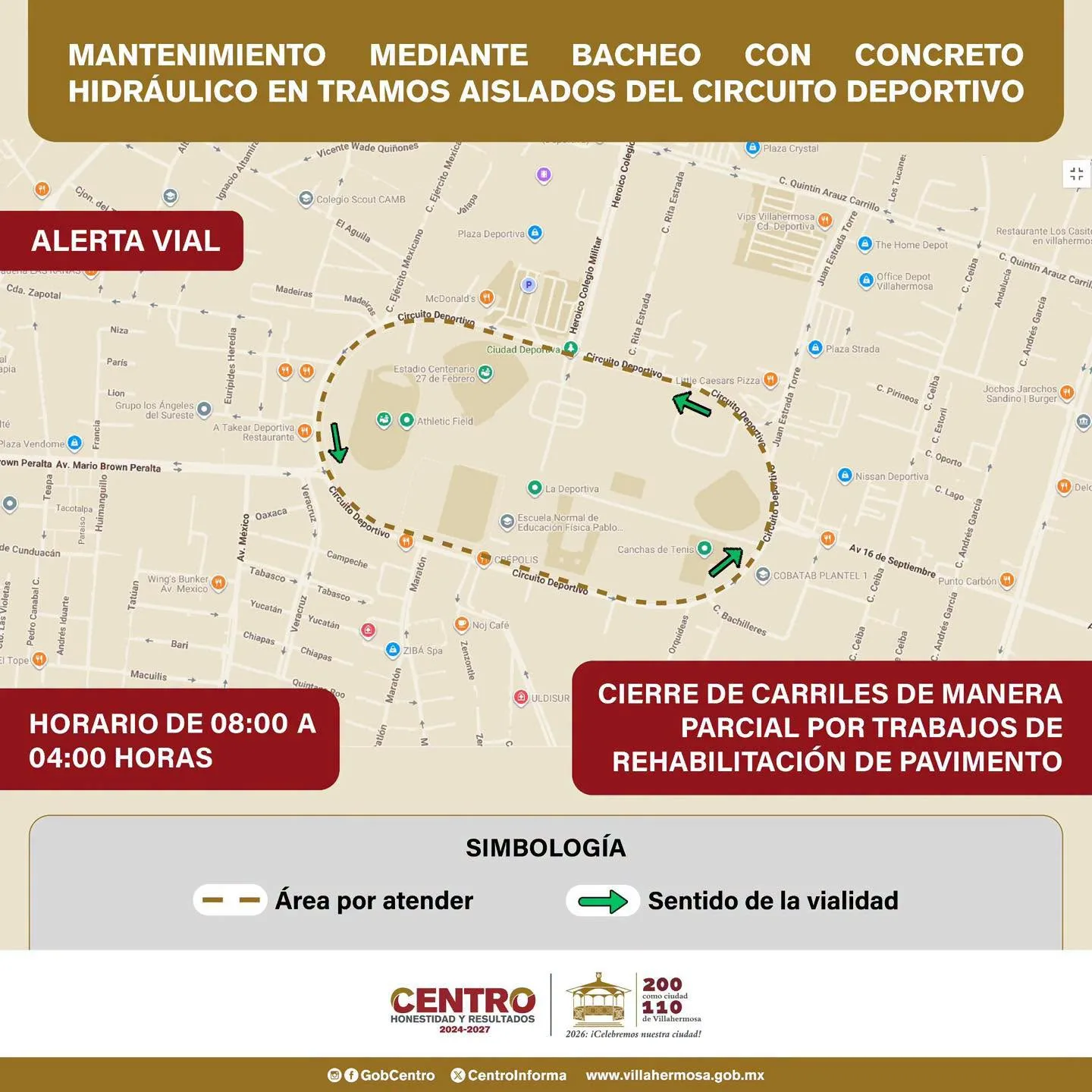 El Ayuntamiento de Centro informó que continúan los trabajos de mantenimiento con concreto hidráulico en tramos aislados del Circuito Deportivo, como parte del Programa Especial de Rehabilitación de Vialidades e Infraestructura Hidráulica.