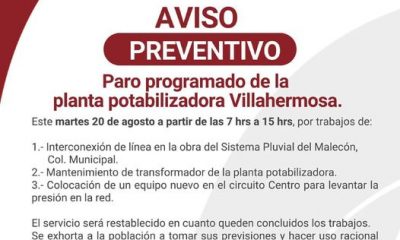 El Ayuntamiento de Centro recuerda a la ciudadanía que la Planta Potabilizadora Villahermosa suspenderá temporalmente sus actividades mañana, 20 de agosto, debido a trabajos de mantenimiento...