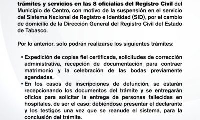 Villahermosa, Tabasco.– Debido a fallas técnicas reportadas por la Dirección General del Registro Civil del Estado, fue suspendido el servicio del Sistema Nacional de Registro e...
