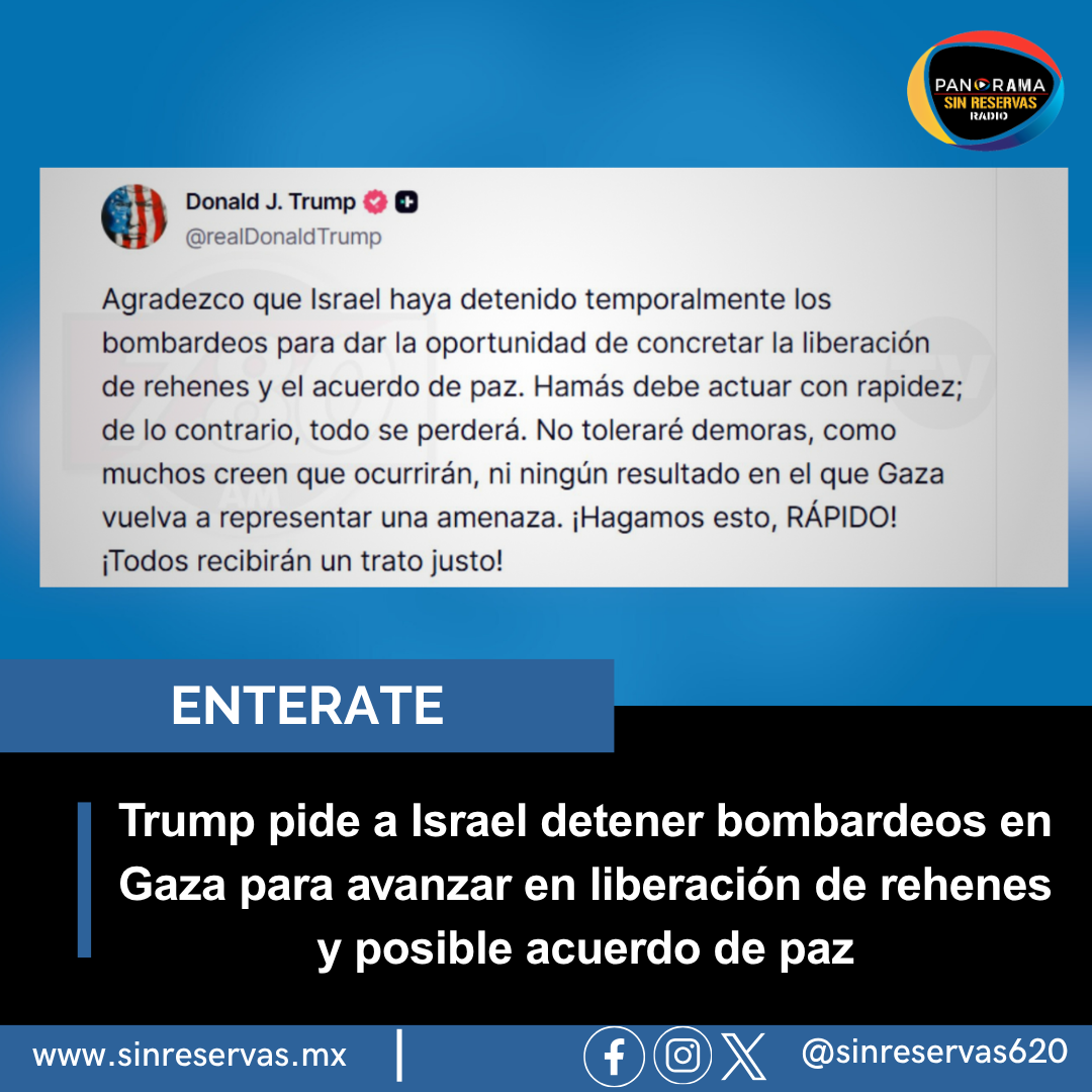 El presidente de Estados Unidos, Donald Trump, solicitó que Israel 🇮🇱 detenga de manera temporal los bombardeos 💣 sobre Gaza 🇵🇸, con el objetivo de facilitar la liberación de rehenes 🕊️ y abrir la puerta a un posible acuerdo de paz.
