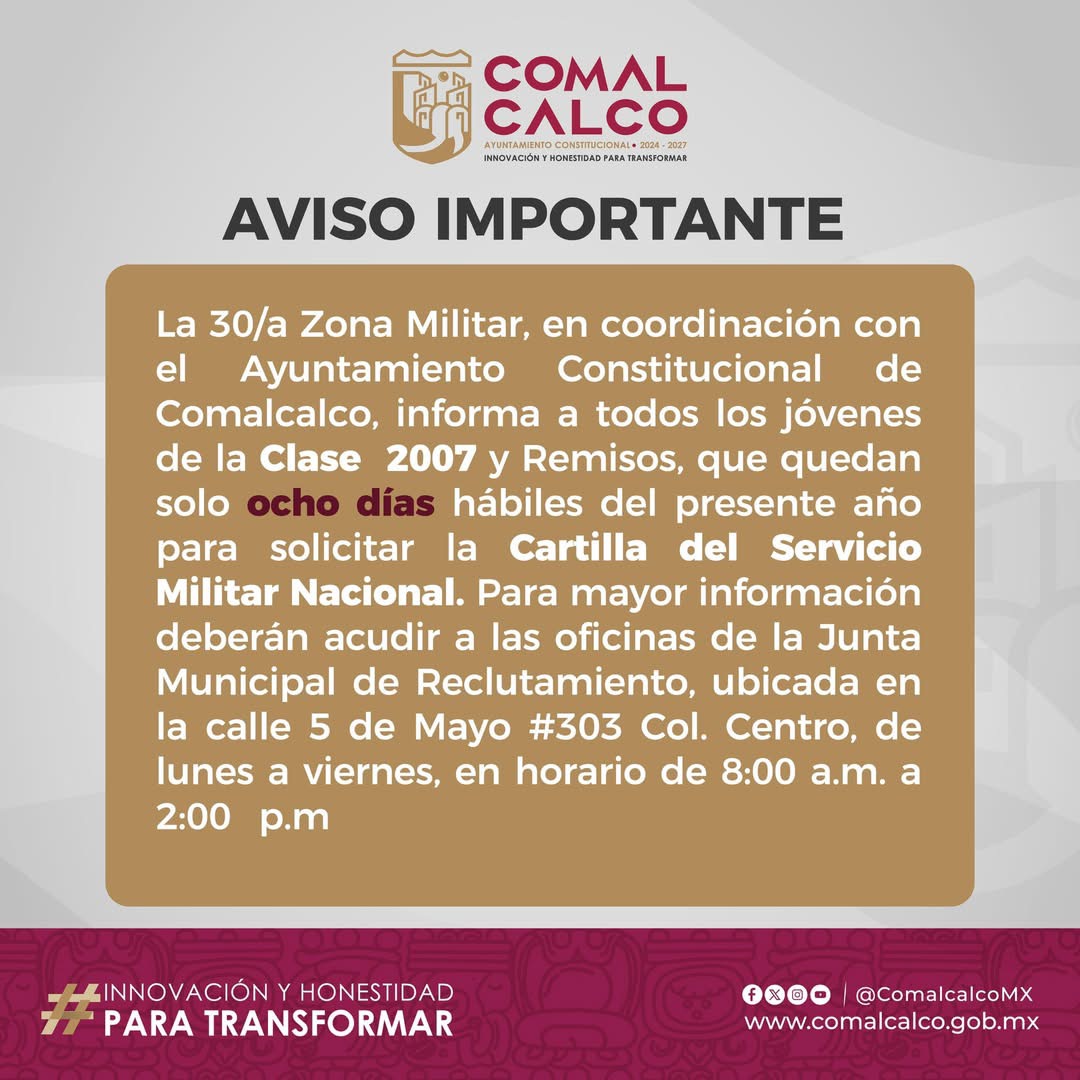 A los jóvenes de la Clase 2007 y Remisos se les recuerda que solo quedan 8️⃣ días hábiles para solicitar la Cartilla del Servicio Militar Nacional.