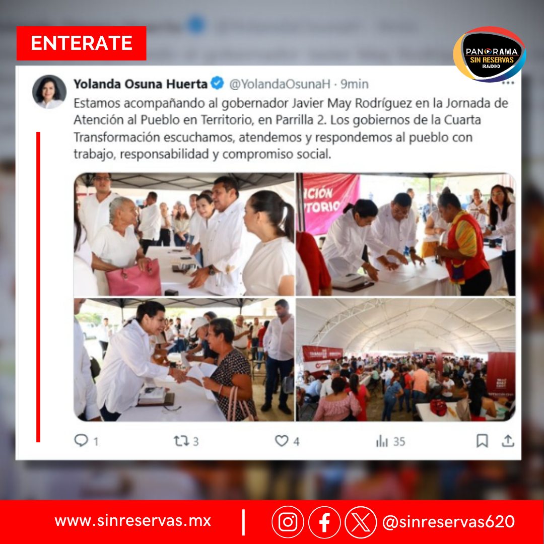 Yolanda Osuna Huerta, informó a través de sus redes sociales que participó junto al gobernador Javier May Rodríguez en la Jornada de Atención al Pueblo en Territorio, realizada en la ranchería Parrilla 2.